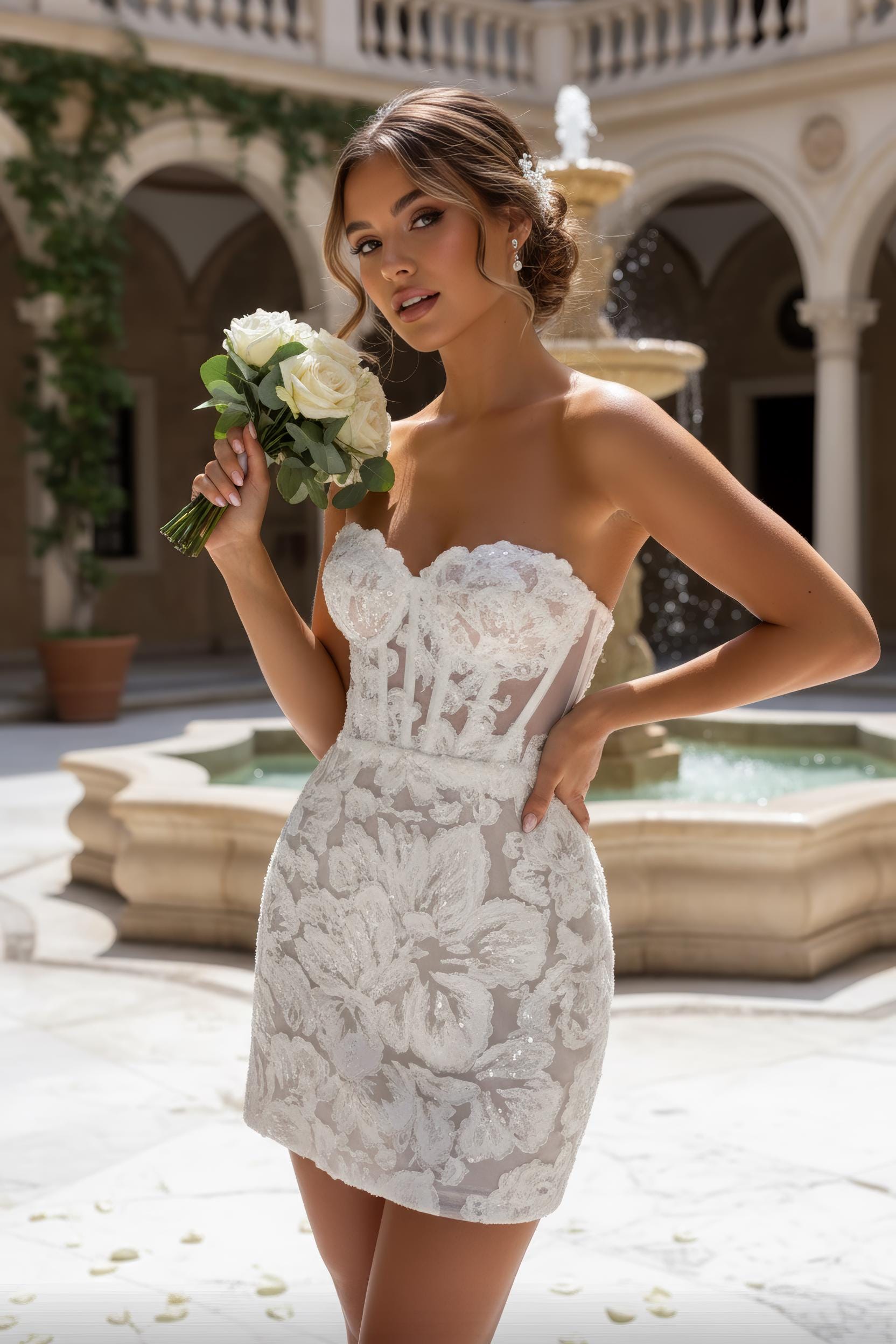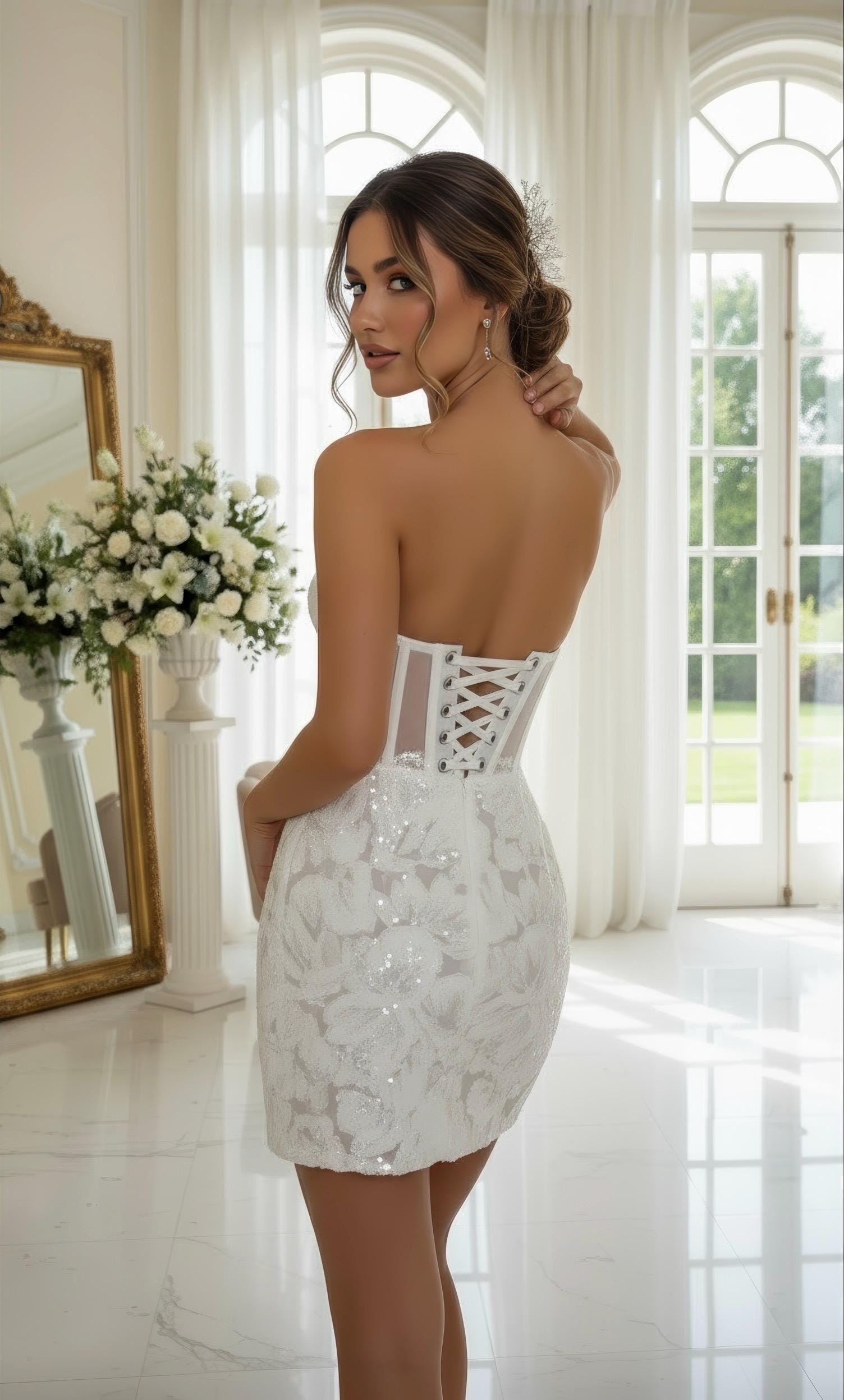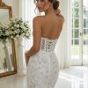 Floral Lace Corset Mini Wedding Dress: Strapless 3d