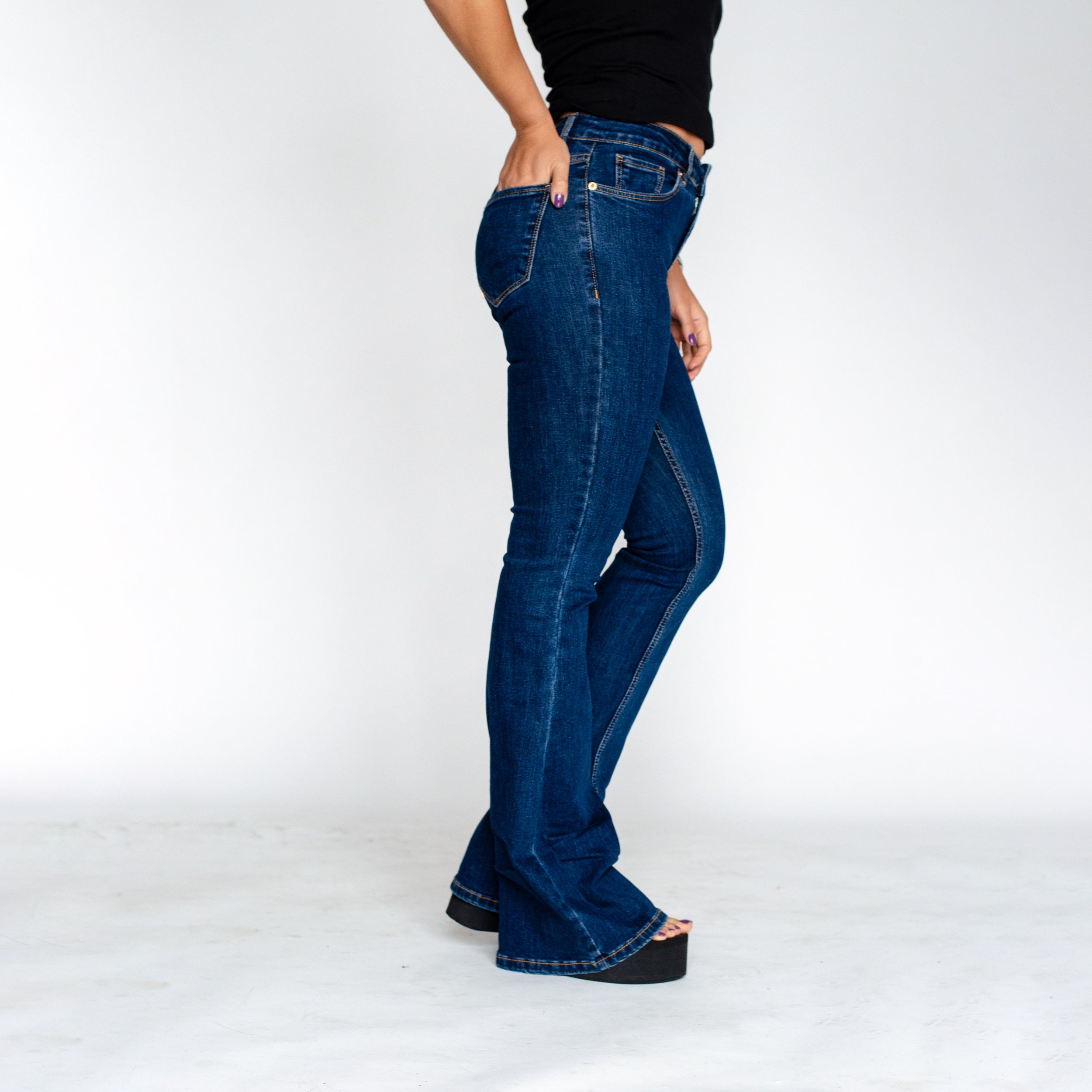 Channel a retro-inspired look with these dark blue high-waisted flare jeans. The flattering high-rise and iconic flare leg create a balanced silhouette that is both stylish and comfortable. Made from a rich, dark wash denim with plenty of stretch, these jeans are perfect for elongating your legs and adding a vintage flair to any outfit.