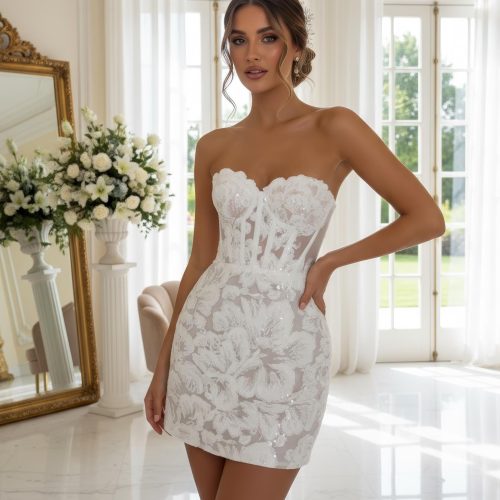 Floral Lace Corset Mini Wedding Dress: Strapless 3d